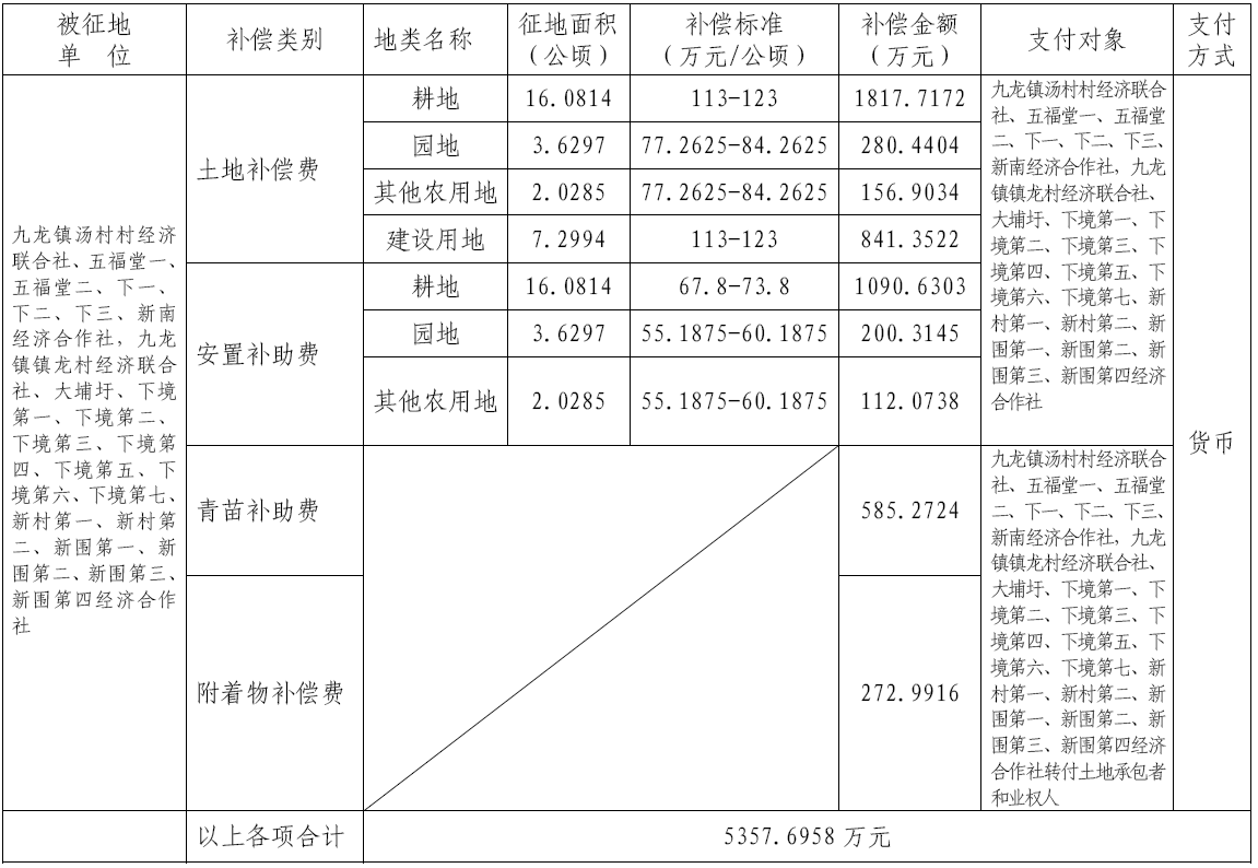 广州市黄埔区九龙镇汤村村经济联合社,九龙镇汤村村五福堂一、五福堂二、下一、下二、下三、新南经济合作社,九龙镇镇龙村经济联合社,九龙镇镇龙村大埔圩、下境第一、下境第二、下境第三、下境第四、下境第五、下境第六、下境第七、新村第一、新村第二、新围第一、新围第二、新围第三、新围第四经济合作社属下集体土地29.0390公顷(合435.5850亩),其中耕地16.0814公顷(合241.2210亩),园地3.6297公顷(合54.4455亩,全部为可调整园地),其他农用地2.0285公顷(合30.4275亩),建设用地7.2994公顷(合109.4910亩)。
