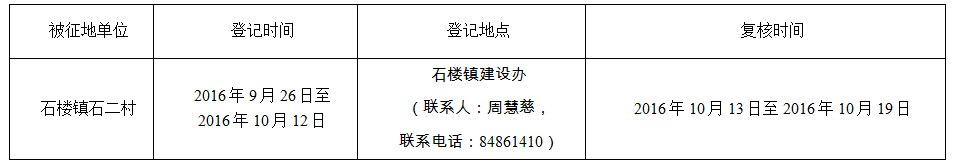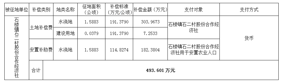 三、被征地村及面积:石楼镇石二村集体土地1.6262公顷(合24.393亩),其中耕地1.5883公顷(合23.8245亩),建设用地0.0379公顷(合0.5685亩)。