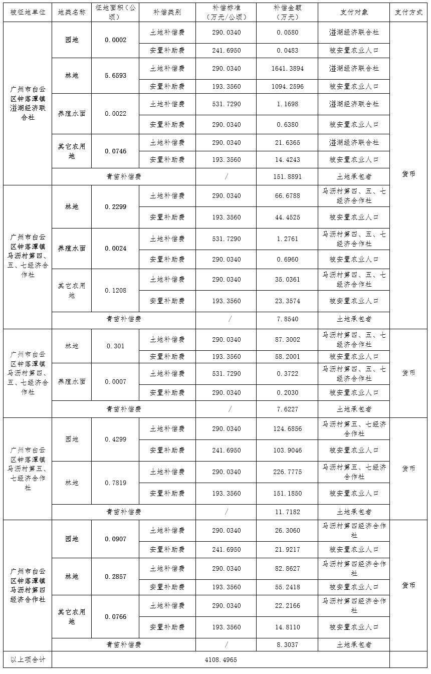 (二)本次征收土地所涉及的被安置农业人员由广州市白云区钟落潭镇湴湖经济联合社、广州市白云区钟落潭镇马沥村第四、第五、第七经济合作社以货币补偿的形式安置。请被征地村在本公告期内到广州市白云区国土资源和规划局领取办理安置农业人口征地农转非手续的函件。