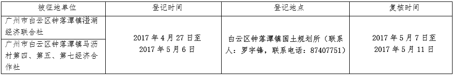 经广州市人民政府同意并经沙巴体育APP批准(粤国土资(建)字〔2017〕112号)同意将白云区钟落潭镇湴湖经济联合社,马沥村第四、第五、第七经济合作社属下的集体土地征收为国有土地。现将经依法批准的《征收土地方案》、市人民政府批准的《征地补偿安置方案》内容和有关事项公告如下: