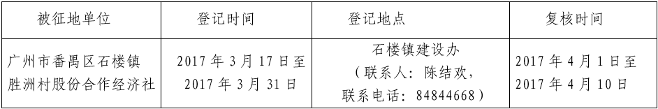 (二)本次征收土地所涉及的被安置农业人员由石楼镇胜洲村以货币补偿的形式安置。请石楼镇胜洲村在本公告期内到番禺区国土资源和规划局领取办理安置农业人口征地农转非手续的函件。