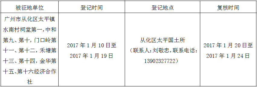 (二)本次征收土地所涉及的被安置农业人员由广州市从化区太平镇水南村祠堂第一,中和第九、第十,门口岭第十一、第十二,禾塘第十三、第十四,金华第十五、第十六经济合作社以货币补偿等形式安置。