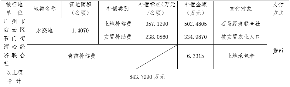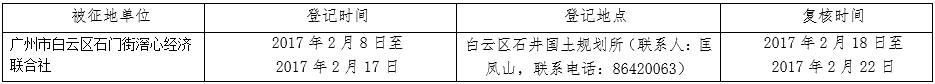 (二)本次征收土地所涉及的被安置农业人员由广州市白云区石门街滘心经济联合社以货币补偿的形式安置。请被征地村在本公告期内到广州市白云区国土资源和规划局领取办理安置农业人口征地农转非手续的函件。