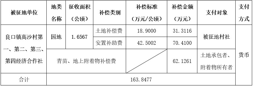 (二)本次征收土地所涉及的被安置农业人员由广州市从化区良口镇高沙村第一、第二、第三、第四经济合作社以货币补偿等形式安置。