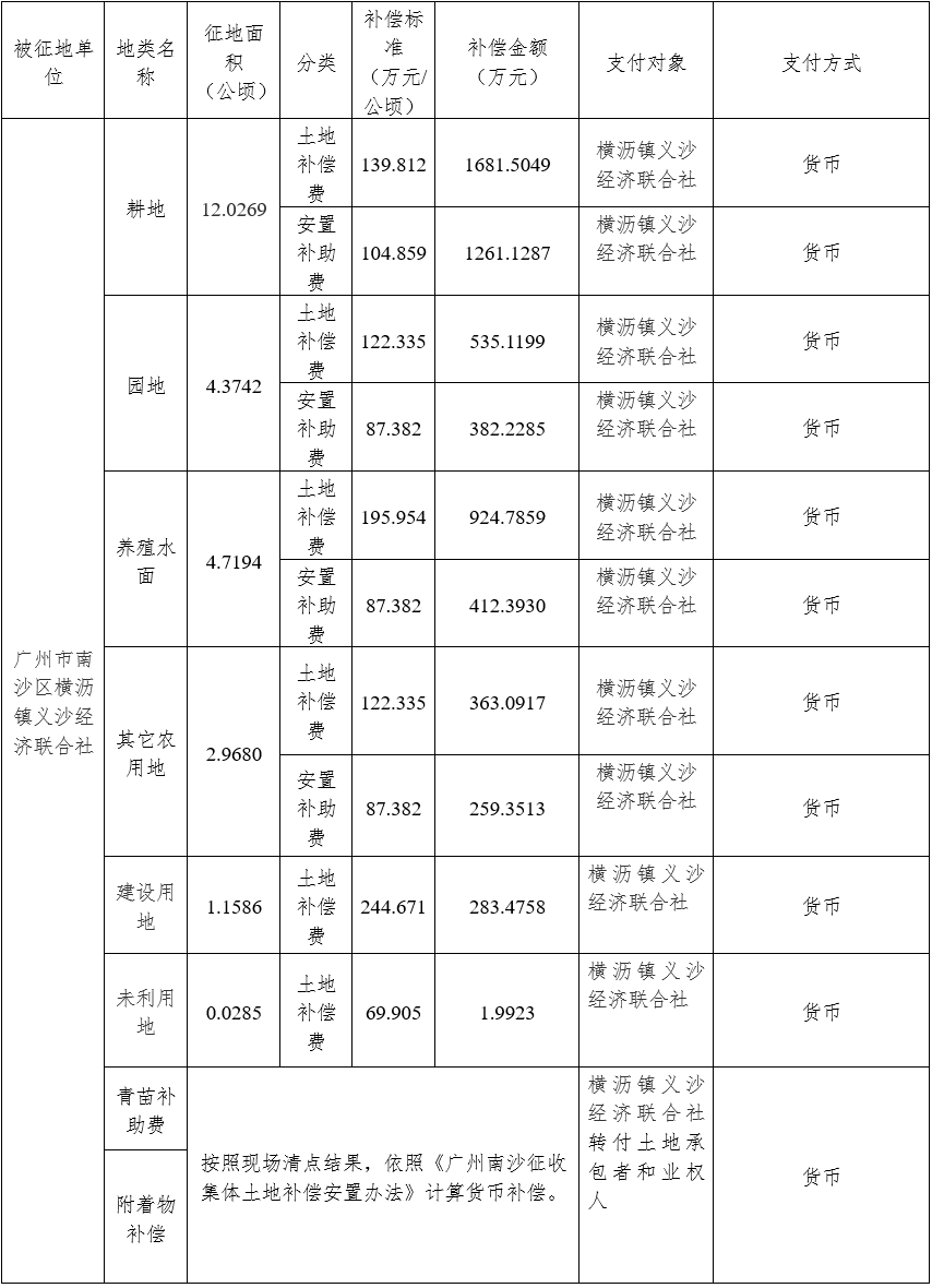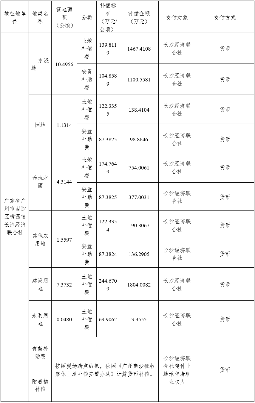 (二)本次征收土地所涉及的被安置农业人员由南沙区南沙街广隆股份合作经济联合社、横沥镇长沙经济联合社、横沥镇义沙经济联合社以货币补偿的形式安置。请南沙区南沙街广隆股份合作经济联合社、横沥镇长沙经济联合社、横沥镇义沙经济联合社在本公告期内到广州市南沙区国土资源和规划局领取办理安置农业人口征地农转非手续的函件。