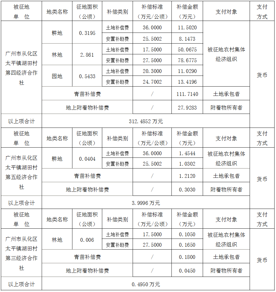 (二)本次征收土地所涉及的被安置农业人员由广州市从化区太平镇湖田村第三、第四、第五经济合作社以货币补偿等形式安置。