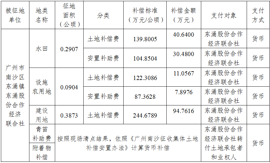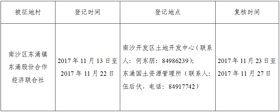 (二)本次征收土地所涉及的被安置农业人员由南沙区东涌镇东涌股份合作经济联合社以货币补偿的形式安置。请南沙区东涌镇东涌股份合作经济联合社在本公告期内到广州市南沙区国土资源和规划局领取办理安置农业人口征地农转非手续的函件。