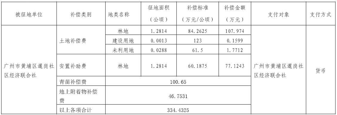 三、被征地村及面积:广州市黄埔区联和街暹岗社区经济联合社属下的集体农用地1.2814公顷(林地1.2814公顷)以及上述有关村集体建设用地0.0013公顷、未利用地0.0288公顷,合计1.3115公顷。