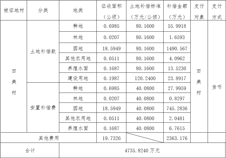 花都区新华街田美村,集体用地合计19.7326公顷(295.989亩),其中耕地0.6985公顷、林地0.0207公顷、园地18.5949公顷、其他农用地0.0511公顷、养殖水面0.1687公顷,建设用地0.1987公顷。
