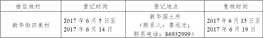 五、被征收土地四至范围内的土地所有权人、使用权人在本公告规定的期限内,持土地权属证书或其他有关证明材料,到指定的地点办理征地补偿登记,请互相转告。