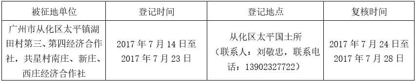 (二)本次征收土地所涉及的被安置农业人员由广州市从化区太平镇湖田村第三、第四经济合作社,共星村南庄、新庄、西庄经济合作社以货币补偿等形式安置。