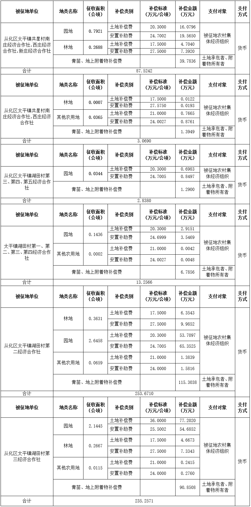 (二)本次征收土地所涉及的被安置农业人员由广州市从化区太平镇共星村南庄、西庄经、新庄经济合作社,湖田村第一、第二、第三、第四、第五经济合作社以货币补偿等形式安置。
