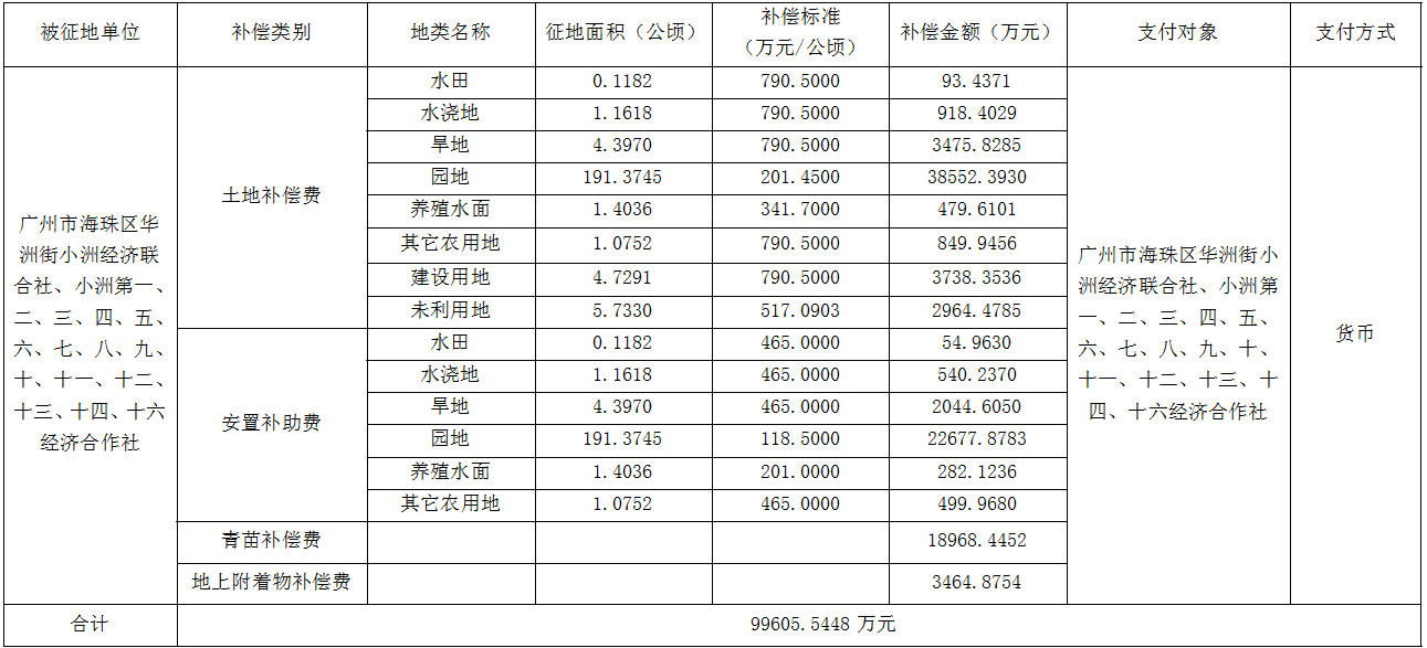 (二)本次征收土地所涉及的被安置农业人员由广州市海珠区华洲街小洲经济联合社、小洲第一、二、三、四、五、六、七、八、九、十、十一、十二、十三、十四、十六经济合作社以货币补偿的形式安置。