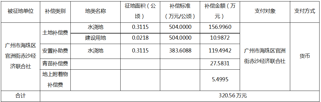 三、被征地村社及面积:广州市海珠区官洲街赤沙经济联合社集体农用地0.3115公顷、集体建设用地0.0218公顷,合计0.3333公顷(合4.9995亩)。