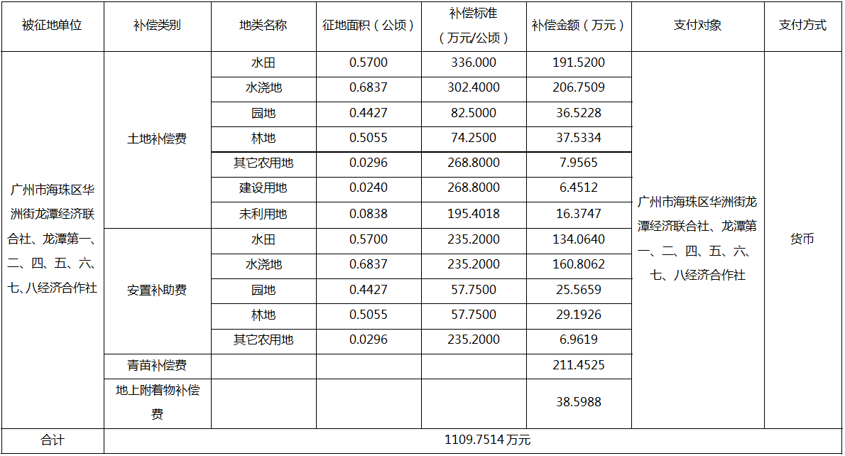 三、被征地村社及面积:广州市海珠区华洲街龙潭经济联合社、龙潭第一、二、四、五、六、七、八经济合作社、集体农用地2.2315公顷、集体建设用地0.0240公顷、集体未利用地0.0838公顷,合计2.3393公顷(合35.0895亩)。