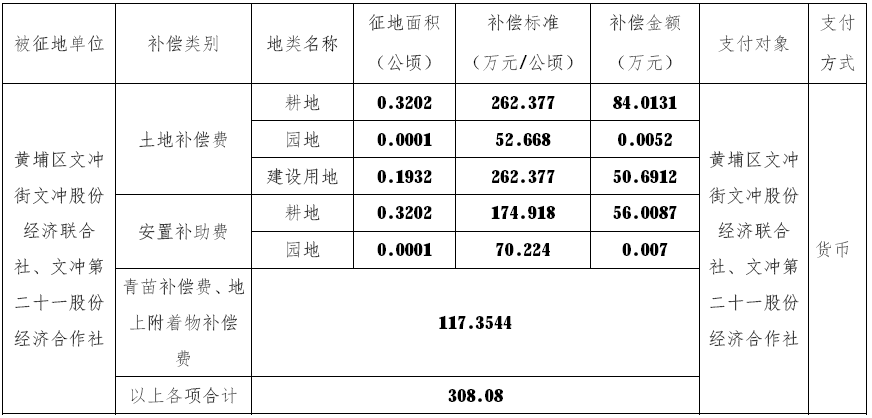 三、被征地村及面积:广州市黄埔区文冲街文冲股份经济联合社、文冲第二十一股份经济合作社属下的集体农用地0.3203 公顷(耕地0.3202 公顷、园地0.0001 公顷)以及上述有关村集体建设用地0.1932公顷,合计0.5135 公顷。