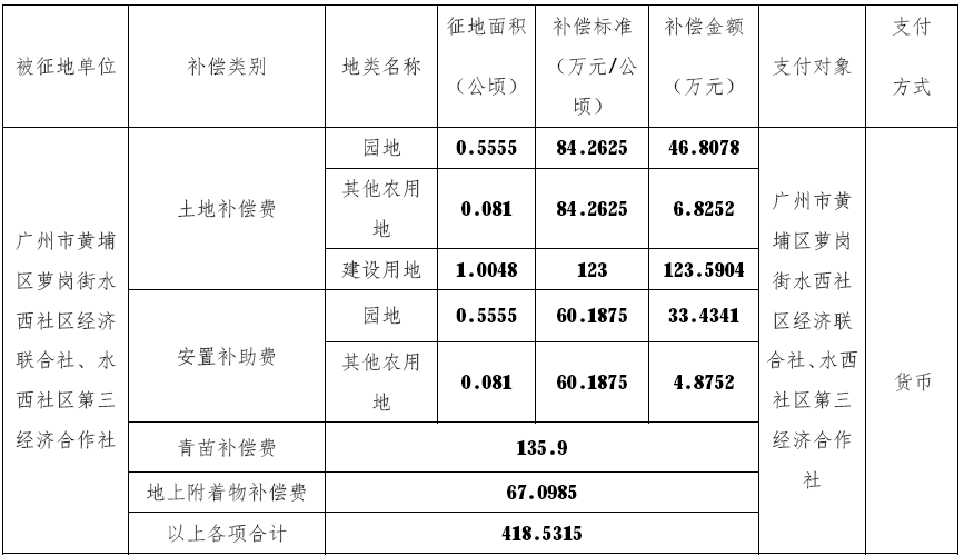 三、被征地村及面积:广州市黄埔区萝岗街水西社区经济联合社、水西社区第三经济合作社属下的集体农用地0.6365公顷(园地0.5555 公顷(均为可调整园地)、其他农用地0.0810公顷(不含养殖水面))以及上述有关村集体建设用地1.0048公顷,合计1.6413 公顷。