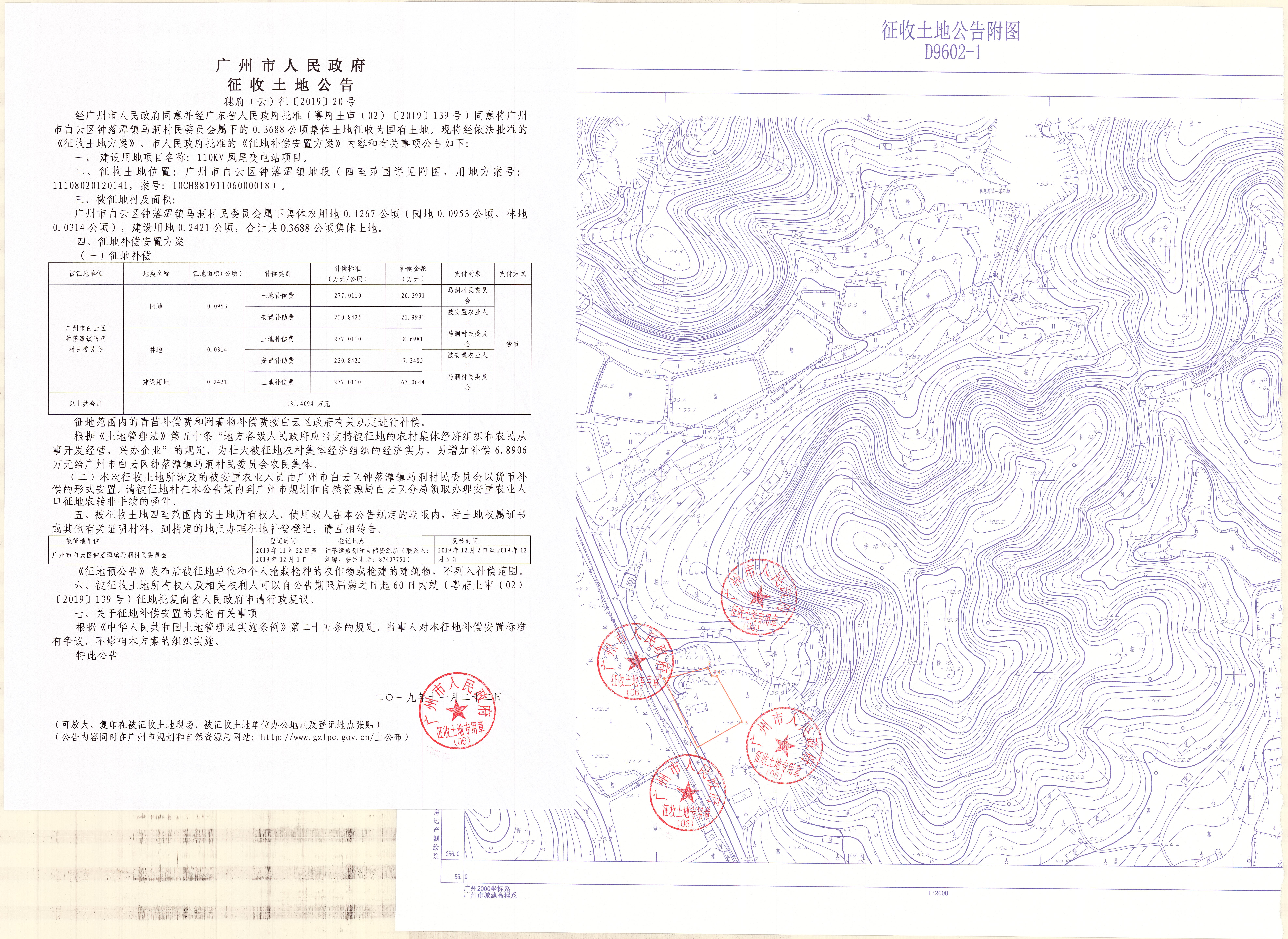经广州市人民政府同意并经沙巴体育平台批准(粤府土审(02)〔2019〕139号)同意将广州市白云区钟落潭镇马洞村民委员会属下的0.3688公顷集体土地征收为国有土地。现将经依法批准的《征收土地方案》、市人民政府批准的《征地补偿安置方案》内容和有关事项公告如下:
