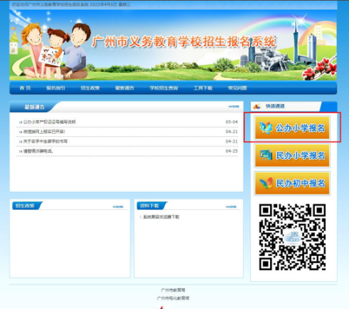 2022 年广州市义务教育公办小学招生报名时间为2022年5月6日上午9:00至2022年5月10日21:30。报名期间,家长只需使用谷歌浏览器登录广州市义务教育学校招生报名系统(https://zs.gzeducms.cn),点击右侧“公办小学报名”按钮,按居住地地址选择所属区域,如:越秀区,进入公办小学报名系统首页,填写完整“新生基本信息”、“户籍房产信息”、“住房信息”、“监护人信息”环节的内容后,点击同意授权查询名下房产情况后,即可完成报名,方便快捷。