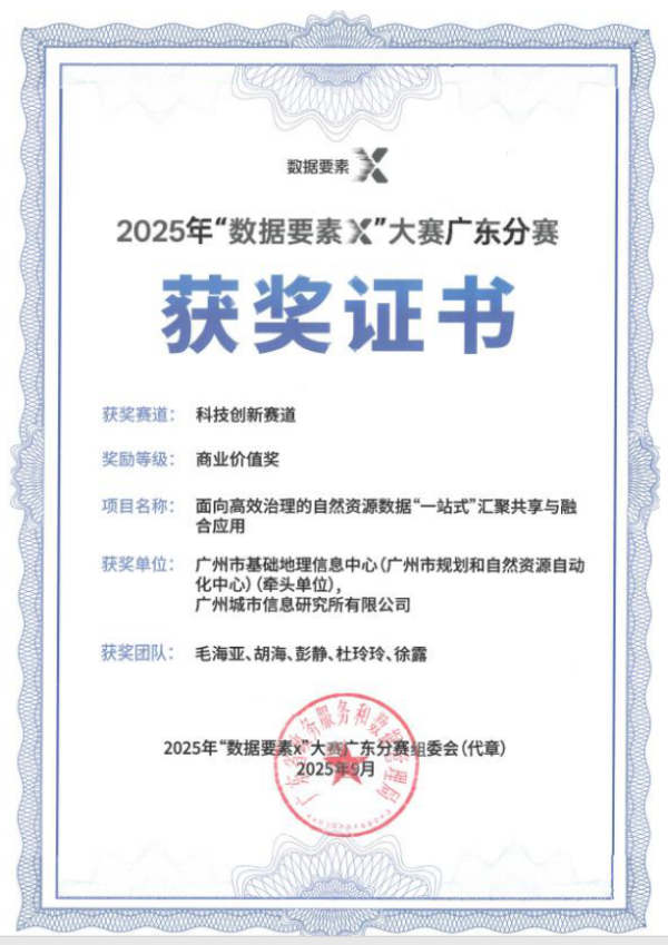 在近日落下帷幕的2025年“数据要素X”大赛广东分赛中,广州市基础地理信息中心精准布局、多点发力,选派5个优质项目分别参与现代农业、开放性创新、城市治理和科技创新四大赛道的角逐。历经4个多月的激烈比拼,5个项目在不同赛道上全面绽放、表现亮眼,全部成功闯入决赛。最终,中心凭借扎实的业务积累与出色的创新实力,从众多参赛项目中脱颖而出,斩获1项二等奖、4项特色奖的优异成绩,实现“参赛项目全部获奖、每条赛道皆有收获”的圆满成果,展现出在多元业务领域的综合竞争力与持续创新活力。