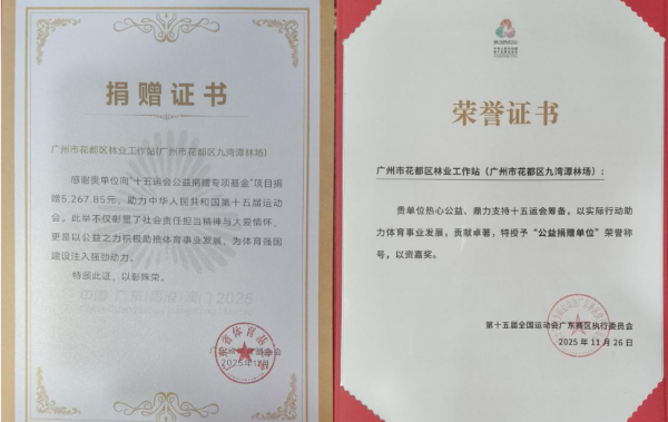 近日,沙巴体育平台花都区分局下属单位九湾潭林场(以下简称“九湾潭林场”)收到来自第十五届全国运动会广东赛区组委会颁发的荣誉捐赠证书。