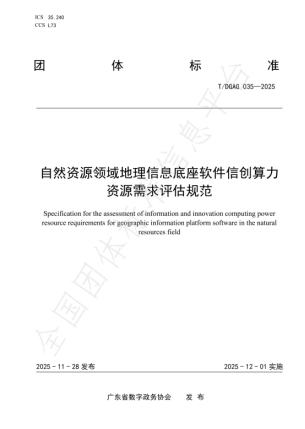 近日,由广州市基础地理信息中心牵头编制的《自然资源领域地理信息底座软件信创算力资源需求评估规范》(T/DGAG 035—2025) (以下简称《规范》)已通过审批并正式发布。该《规范》作为一项团体标准,旨在建立自然资源领域在国产化环境下开展地理信息底座软件建设与部署时的统一算力评估体系,为行业提供可操作、可量化的资源测算依据。