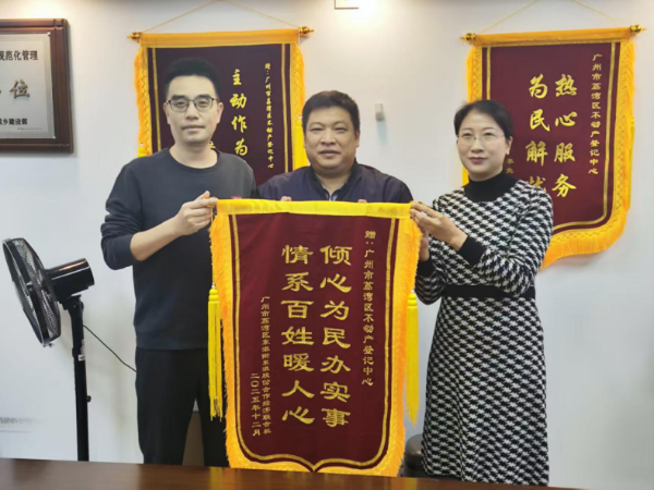 越秀地产也送来锦旗啦!上面写着“功效规范办实事 热情贴心为企业”。他们在荔湾项目多,业务量大,但通过中心的“互联网+不动产登记”服务,动动手指网上申请,刷刷脸就能认证签名,材料邮寄就能搞定领证。省时省力又省心,真正实现了“让数据多跑路,让群众少跑腿”!