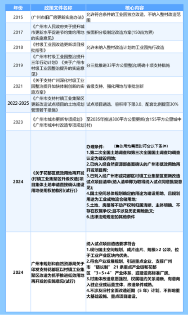 近年来,广州围绕旧厂房改造、村镇工业集聚区整治提升、低效用地再开发等重点工作,出台多项配套政策文件和相关的规划研究,为存量低效工业提供强有力支撑。从2015年允许符合条件的工业园独立改造,到2022年试点项目容积率下限提至3.0、配套比例放宽至30%。花都区于2024年制定相关政策,明确集体土地直接确权条件,多层级政策体系不断迭代完善,为村镇工业集聚区改造扫清障碍、释放红利。
