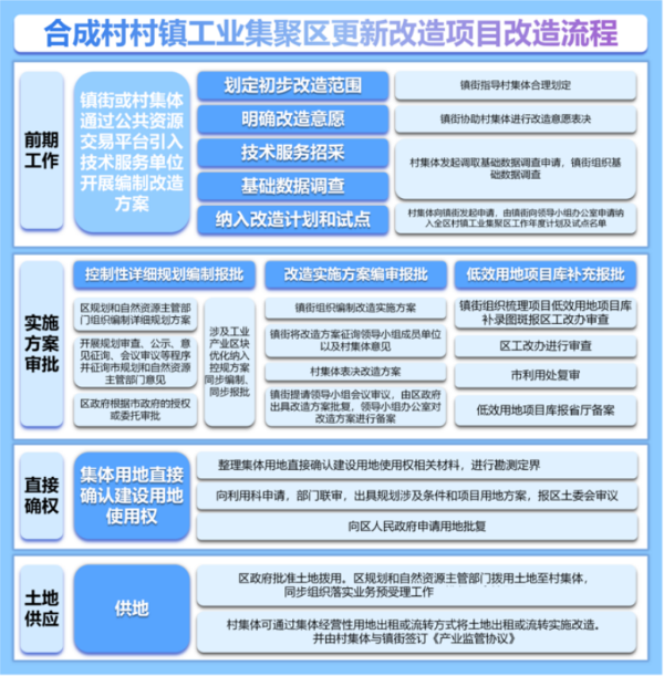 截至2025年12月底,合成村村镇工业集聚区改造项目已顺利完成规划调整与实施方案编制,集体土地直接确权手续全部办结。后续计划以村集体为开发主体,导入国内具有实力的开发运营合作单位,有效提高合成区域片区经济和产业竞争力,全流程服务有效疏通了项目推进中的堵点难点。