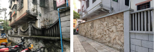 为了尊重关围历史、保留人文特色,从化区分局积极挖掘关围新村的小区文化底蕴,深入研究了整个小区的历史文化脉络,以居住安全、居民需求、优化公共环境和场所记忆延续等要素为落脚点,提出了“追寻场所记忆,裨益社区老人”这一理念。在改造后的社区中展现老工业文化元素,把“无形的记忆”融入公共空间的细节中。如用改造过程中废弃的建筑材料设计景观墙和休闲座椅,创造性地把旧工业文化元素以新时代景观手法复利用,延续了粗犷的工业质感。同时增设小区历史回忆景墙,收集并展示居民提供的反映四十年来社区生活巨大变化的历史老照片,让居民重新发现社区价值,重获身份归属感及情感依托和文化认同。通过老旧小区改造,不仅提升了居住环境,更重要的是让六百多户两千多位居民再次记住了鲜活而有温度的生活和情感,让30年历史的关围新村留下了独具一格的场所记忆。