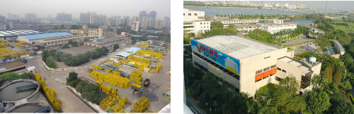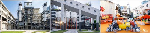 办公楼内的汽轮机;城市广场中保留的水塔;包装车间改造后效果图
