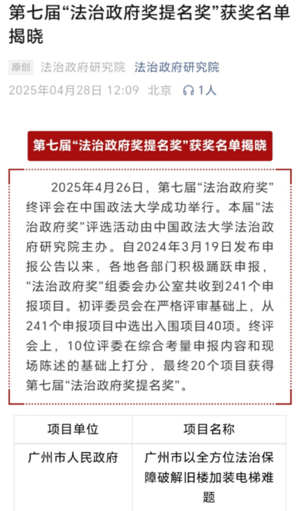 近日,第七届“法治政府奖”评选结果揭晓,由广州市人民政府申报的“广州市以全方位法治保障破解旧楼加装电梯难题”项目,成功斩获“法治政府奖提名奖”!这一荣誉不仅是对广州规划资源领域法治政府建设成果的高度肯定,更为全国破解民生难题提供了可借鉴的“广州样本”。