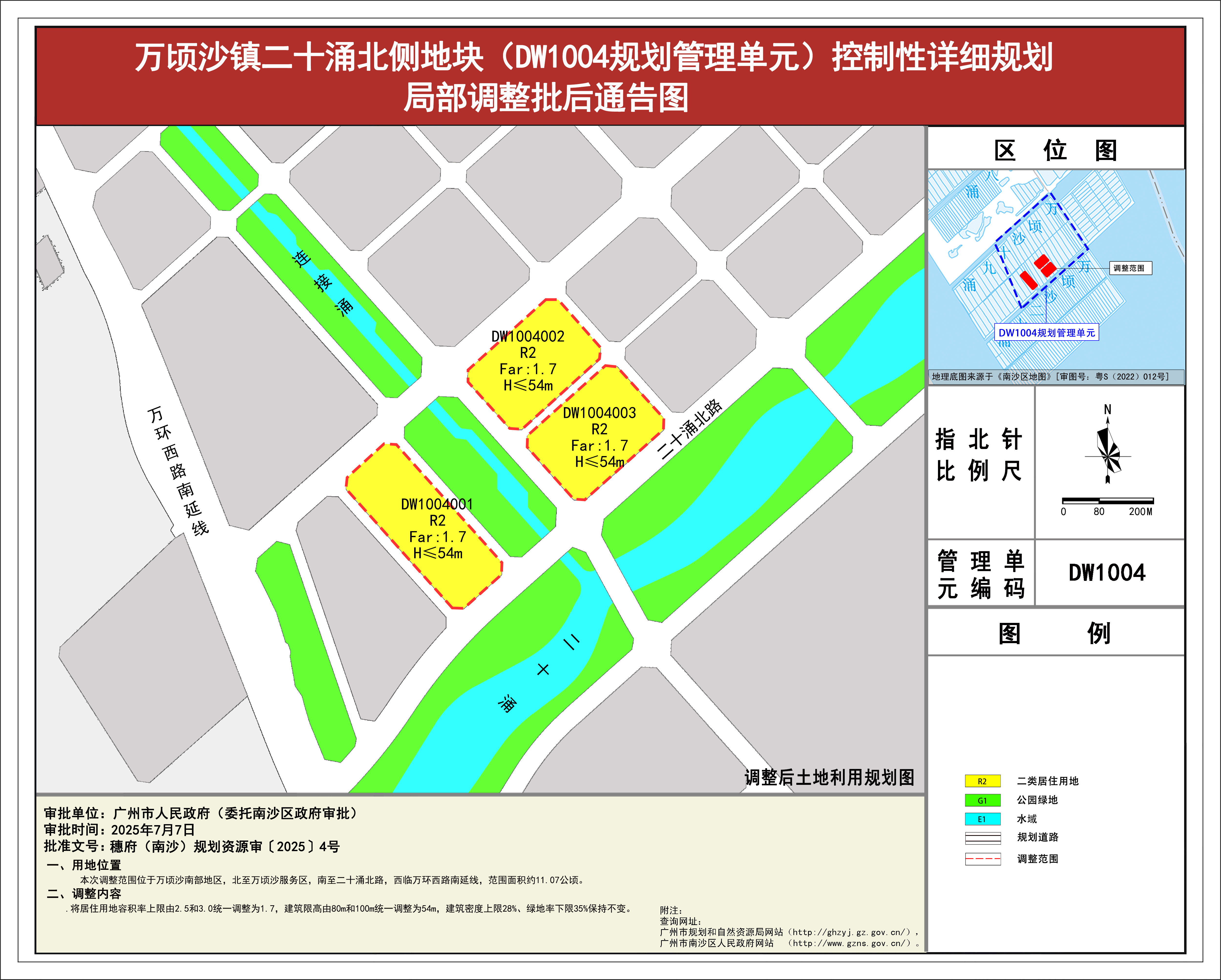 根据《广东省城市控制性详细规划管理条例》《广州市城乡规划程序规定》有关规定,《万顷沙镇二十涌北侧地块(DW1004规划管理单元)控制性详细规划局部调整》已完成规划技术审查、批前公示等程序,并经广州市南沙新区自然资源规划与利用委员会审议通过后获广州市人民政府批准(穗府(南沙)规划资源审〔2025〕4号),自批准之日(2025年7月7日)起生效。