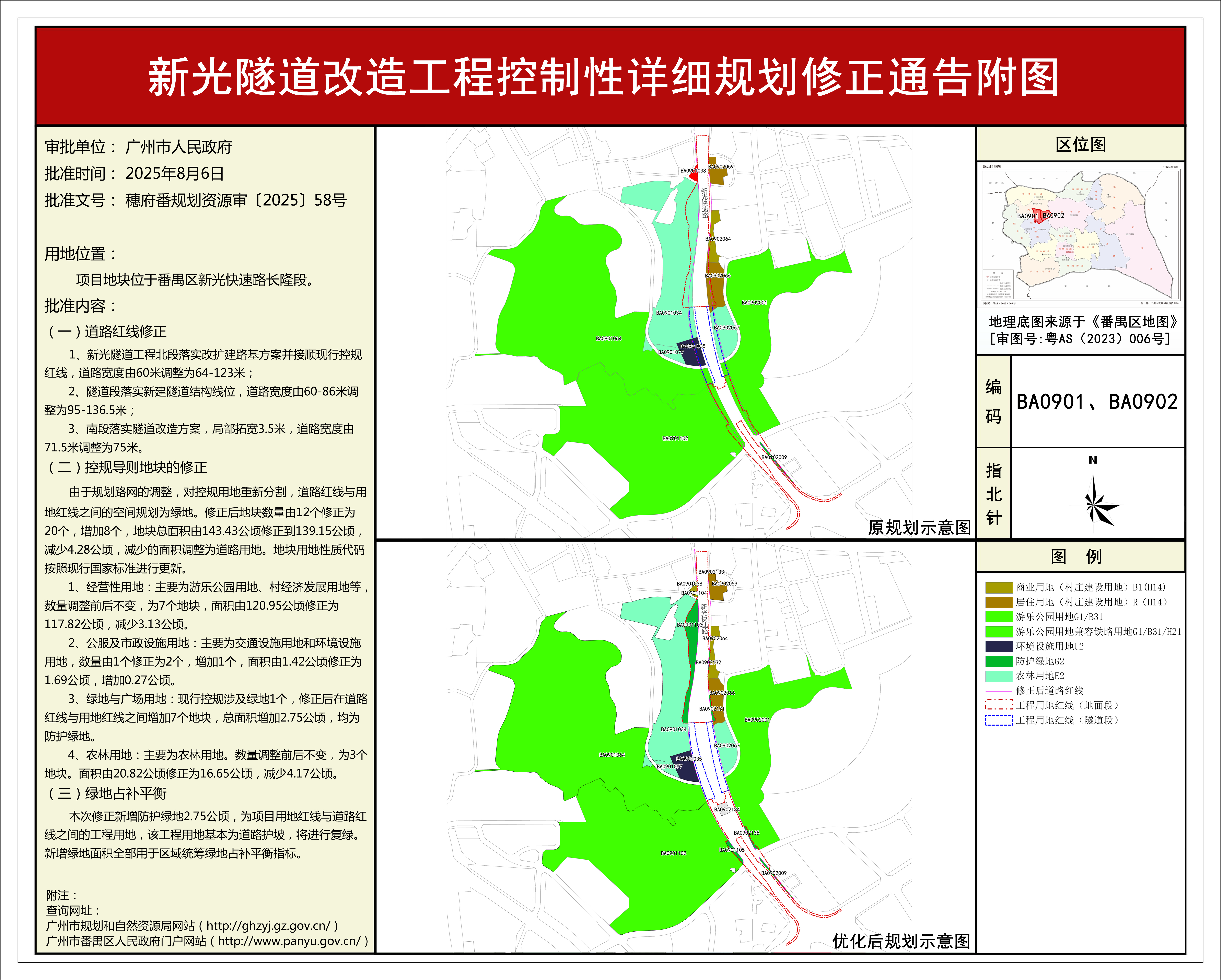 根据《广东省城市控制性详细规划管理条例》、《广州市人民政府关于将一批市级行政职权事项继续委托区实施的决定》(穗府[2019]8号),《新光隧道改造工程控制性详细规划修正》规划成果已完成规划技术审查、批前公示等程序,并经番禺区政府常务会议审议通过后获广州市人民政府批准,自批准之日(2025年8月6日)起生效。