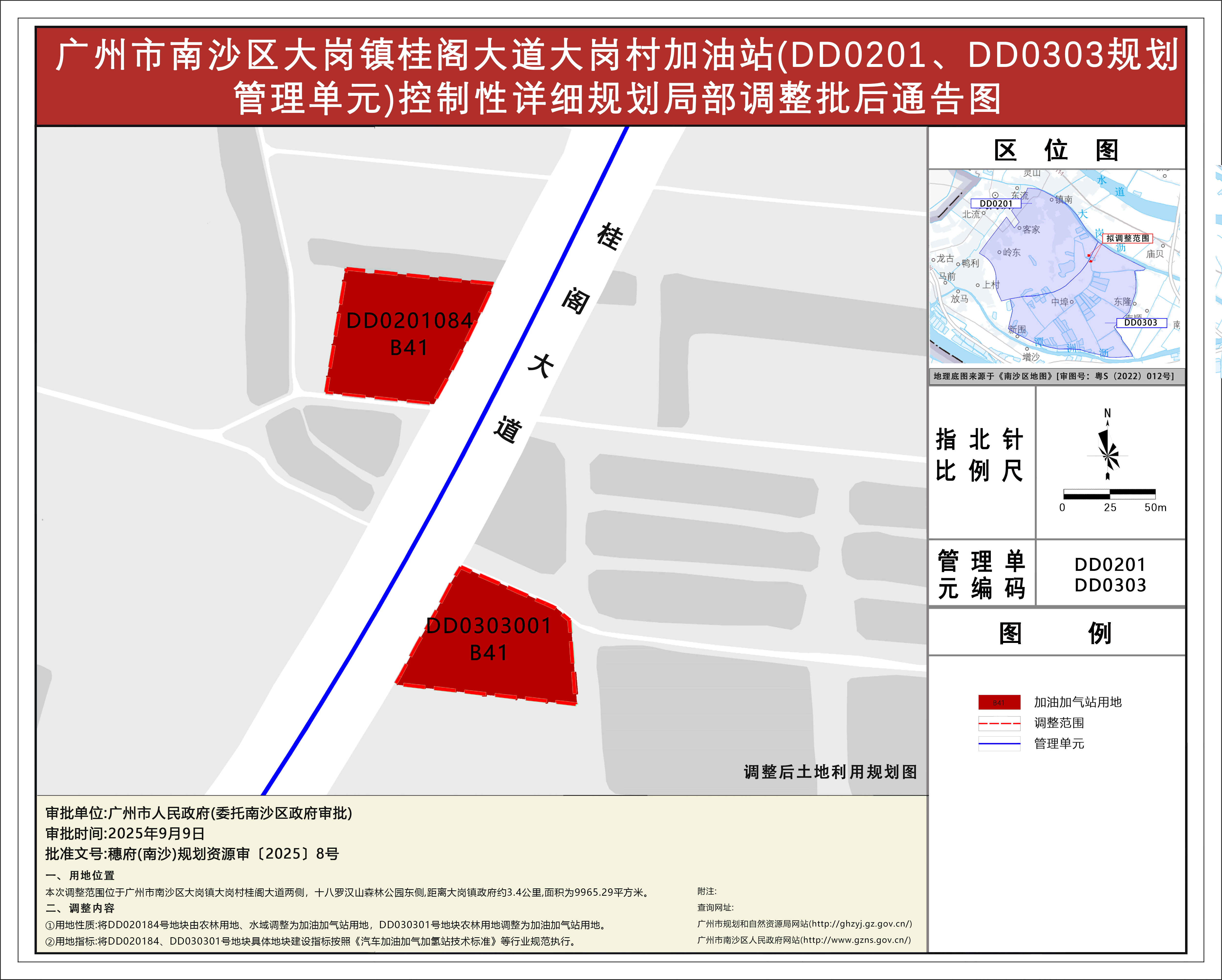 根据《广东省城市控制性详细规划管理条例》《广州市城乡规划程序规定》有关规定,《广州市南沙区大岗镇桂阁大道大岗村加油站(DD0201、DD0303规划管理单元)控制性详细规划局部调整》已完成规划技术审查、批前公示等程序,并经广州市南沙新区自然资源规划与利用委员会审议通过后,获广州市南沙区人民政府(受广州市人民政府委托)批准(穗府(南沙)规划资源审〔2025〕8号),自批准之日(2025年9月9日)起生效。