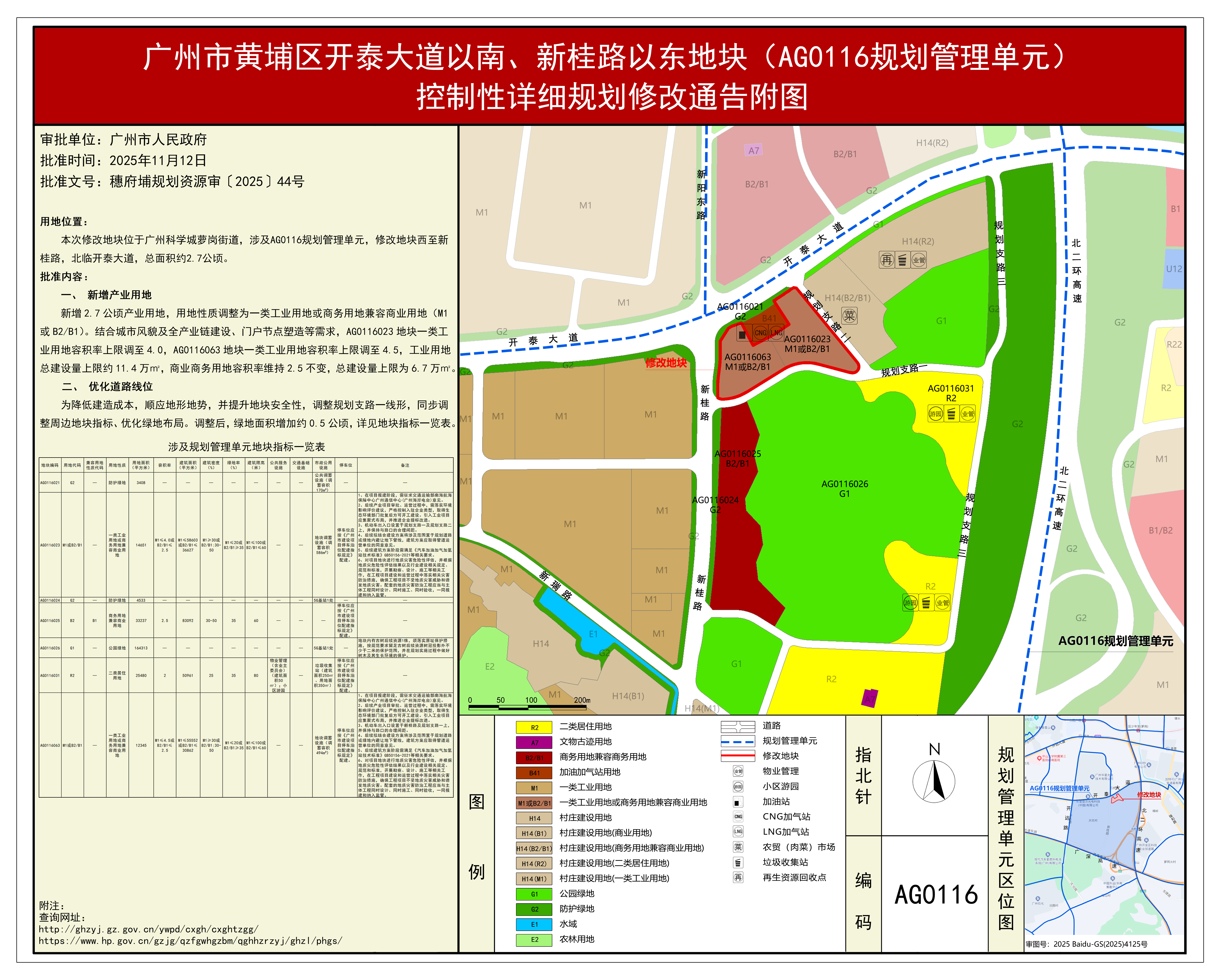 根据《广东省城市控制性详细规划管理条例》要求,《广州市黄埔区开泰大道以南、新桂路以东地块(AG0116规划管理单元)控制性详细规划修改》已完成规划技术审查、批前公示等程序,并经广州市黄埔区广州开发区城乡规划委员会审议通过后获黄埔区人民政府(受市人民政府委托)批准(穗府埔规划资源审〔2025〕44号),自批准之日(2025年11月12日)起生效。