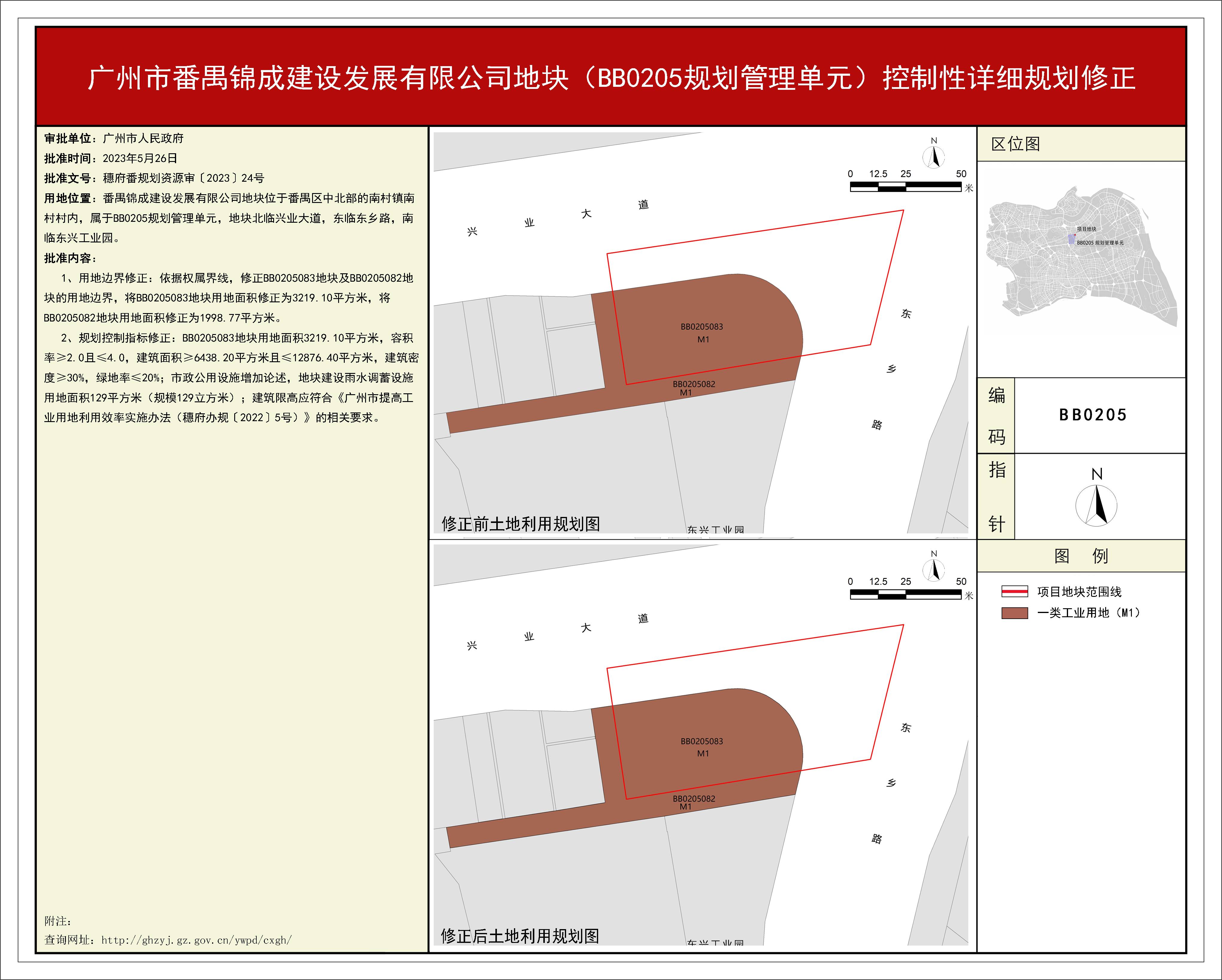 根据《广东省城市控制性详细规划管理条例》、《广州市人民政府关于将一批市级行政职权事项继续委托区实施的决定》(穗府[2019]8号)、《广州市人民政府关于收回一批市级行政权力事项的决定》(广州市人民政府令第188号),《广州市番禺锦成建设发展有限公司地块(BB0205规划管理单元)控制性详细规划修正》规划成果已完成规划技术审查、批前公示等程序,并经番禺区土地和规划领导小组会议审议通过后获广州市人民政府批准,自批准之日(2023年5月26日)起生效。