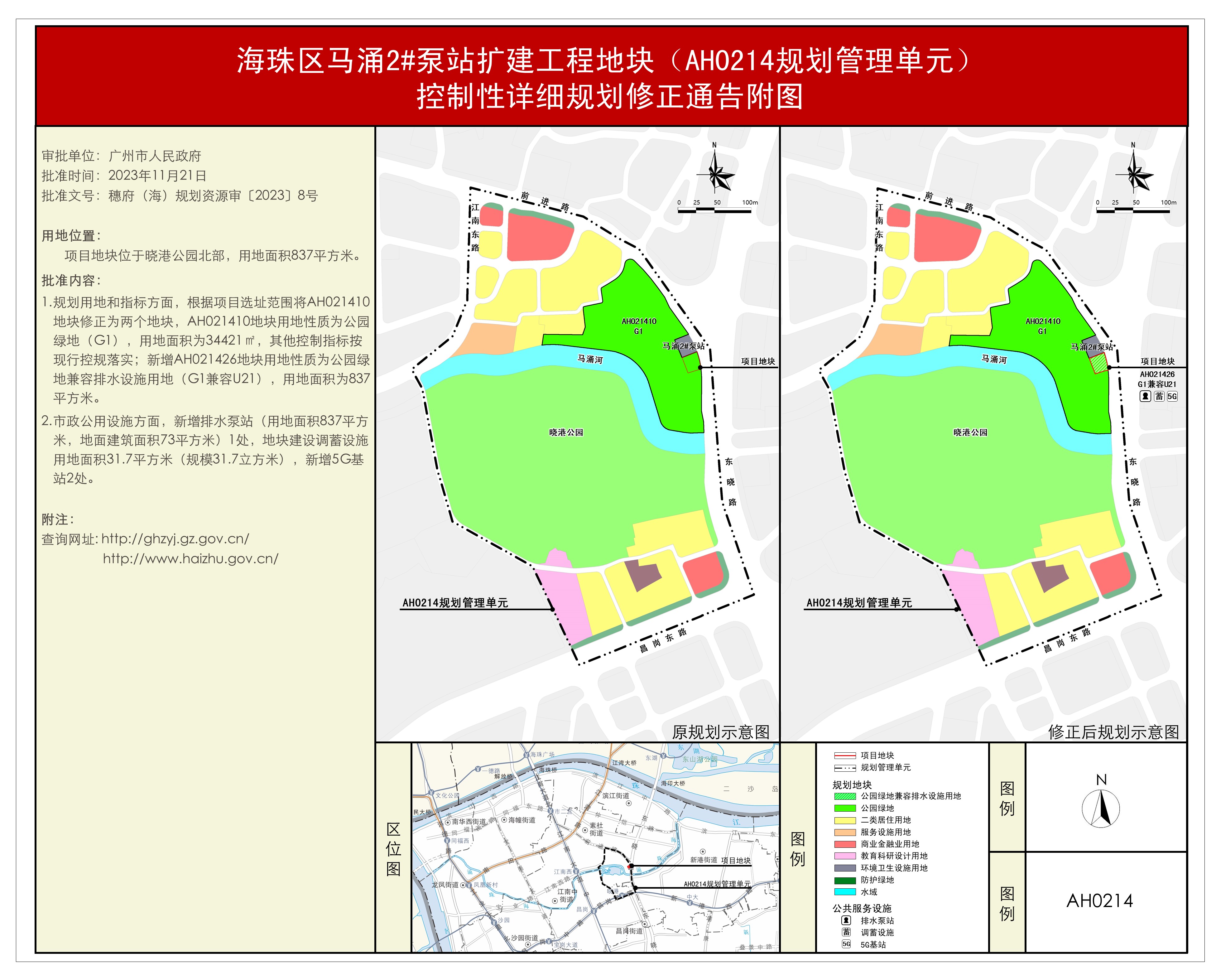 根据《广东省城市控制性详细规划管理条例》,《海珠区马涌2#泵站扩建工程地块(AH0214规划管理单元)控制性详细规划修正》规划成果经广州市海珠区城市规划领导小组会议审议通过后获广州市人民政府批准(穗府(海)规划资源审〔2023〕8号),自批准之日(2023年11月21日)起生效。