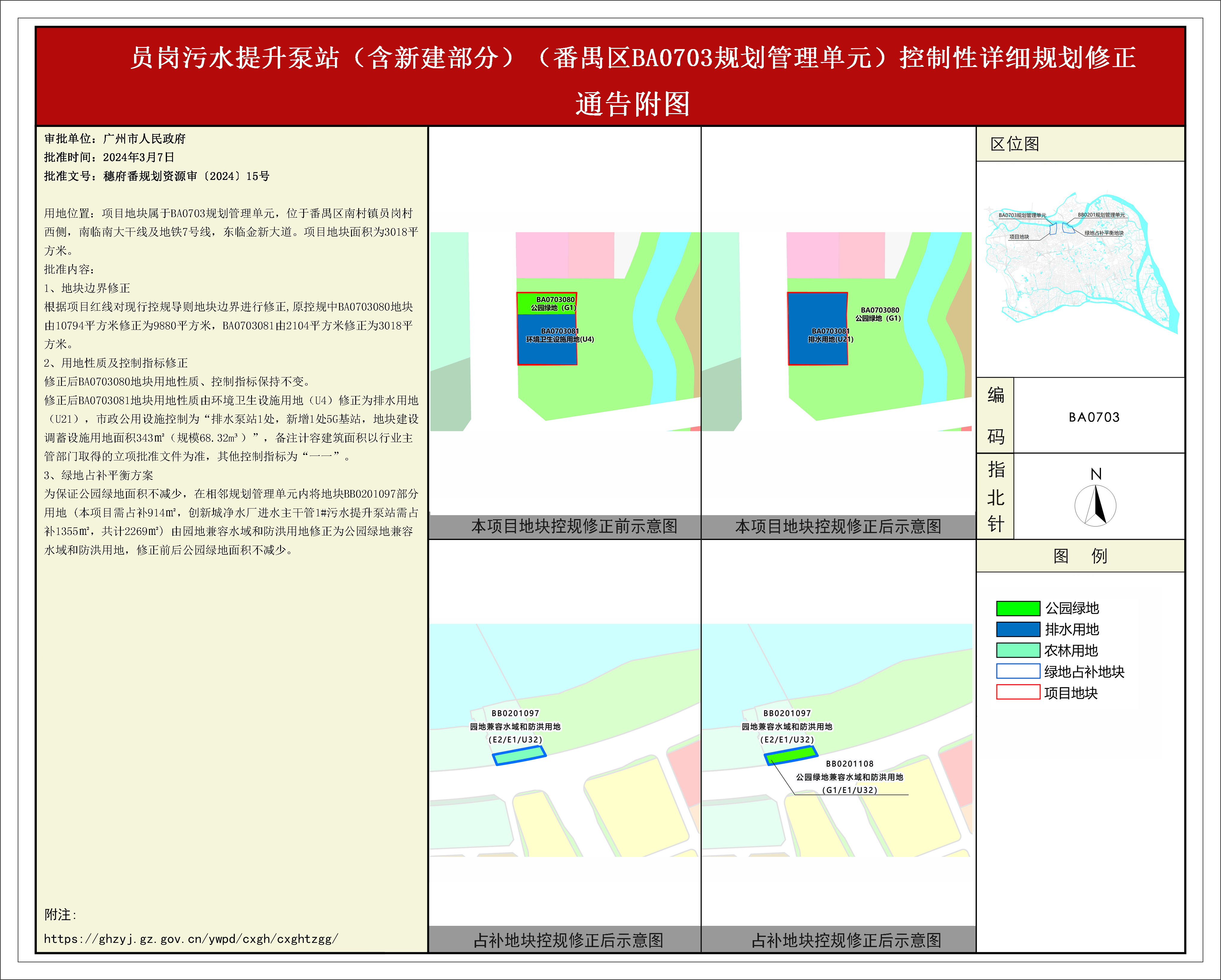 根据《广东省城市控制性详细规划管理条例》、《广州市人民政府关于将一批市级行政职权事项继续委托区实施的决定》(穗府[2019]8号),《员岗污水提升泵站(含新建部分)(番禺区BA0703规划管理单元)控制性详细规划修正》规划成果已完成规划技术审查、批前公示等程序,并经番禺区土地和规划领导小组会议审议通过后获广州市人民政府批准,自批准之日(2024年3月7日)起生效。