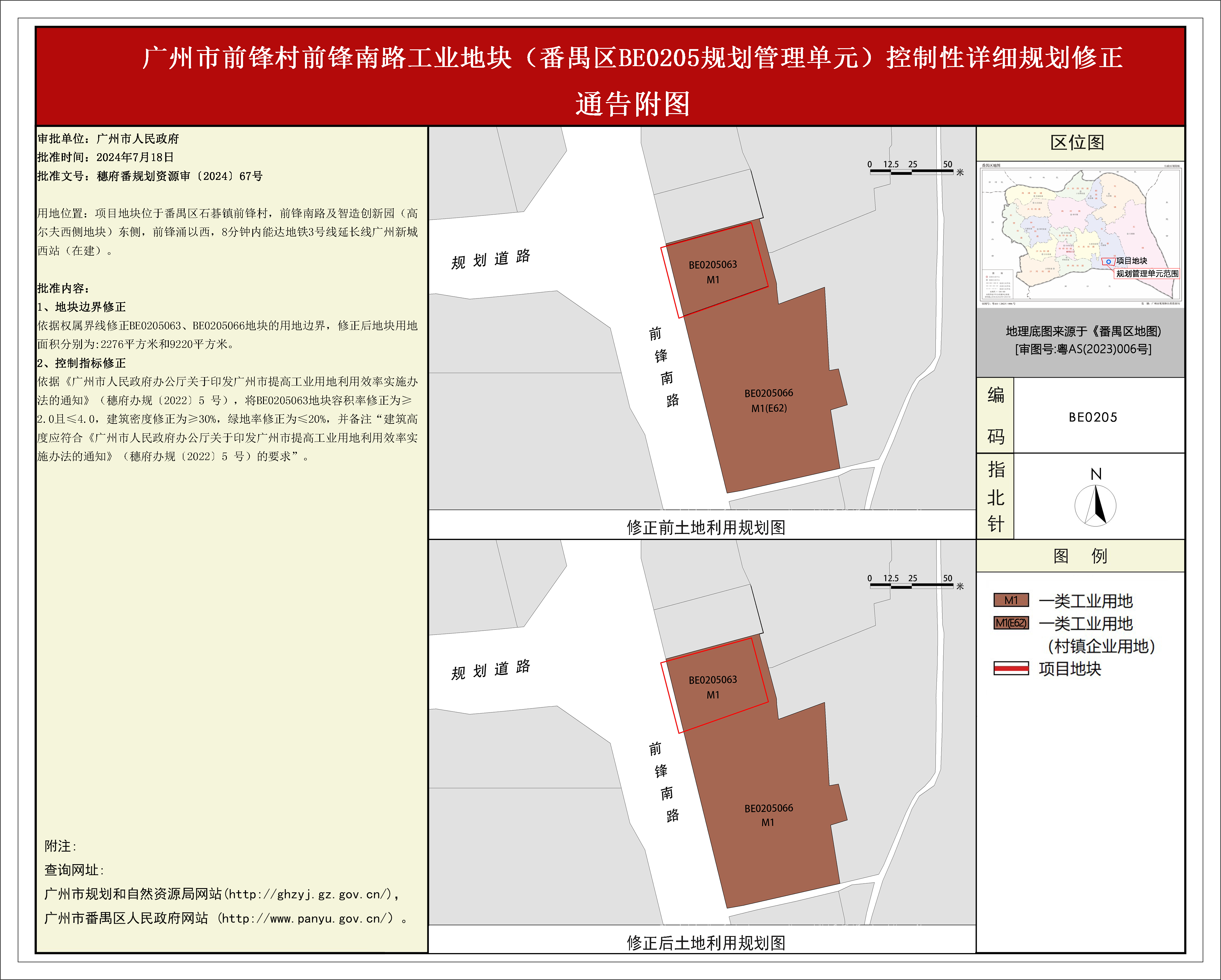 根据《广东省城市控制性详细规划管理条例》,《广州市前锋村前锋南路工业地块(番禺区BE0205规划管理单元)控制性详细规划修正》规划成果已完成规划技术审查、批前公示、征询相关单位意见等程序,并经番禺区土地和规划领导小组会议审议通过后获广州市人民政府批准(穗府番规划资源审﹝2024﹞67号),自批准之日(2024年7月18日)起生效。