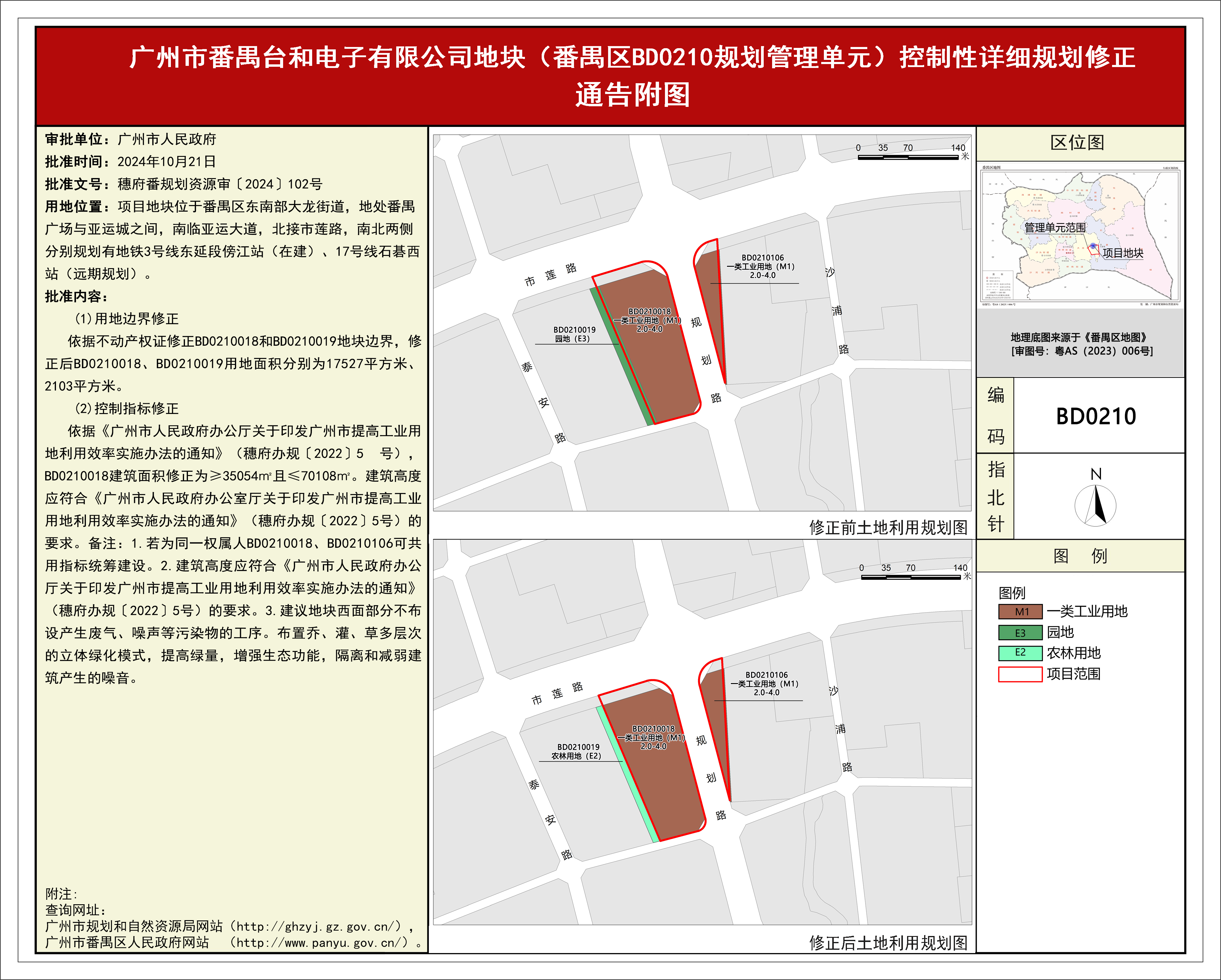 根据《广东省城市控制性详细规划管理条例》,《广州市番禺台和电子有限公司地块(番禺区BD0210规划管理单元)控制性详细规划修正》规划成果已完成规划技术审查、批前公示、征询相关单位意见等程序,并经番禺区土地和规划领导小组会议审议通过后获广州市人民政府批准(穗府番规划资源审﹝2024﹞102号),自批准之日(2024年10月21日)起生效。