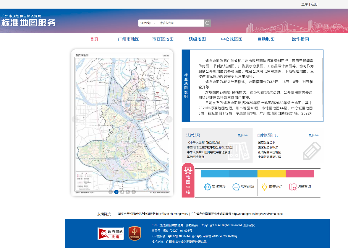 广州市标准地图服务平台是目前国内详细程度最高的权威公益性标准地图服务平台,公众可在此平台进行广州市各级标准地图的在线查询、浏览、制作和下载操作。