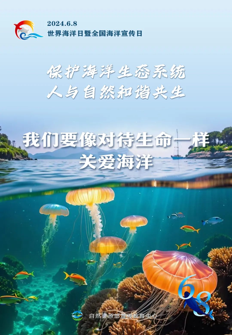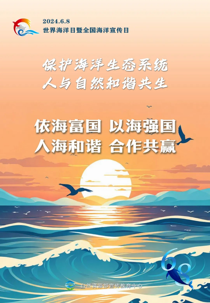 2024年6月8日是第16个世界海洋日和第17个全国海洋宣传日,活动主题是“保护海洋生态系统 人与自然和谐共生”。自然资源部宣传教育中心策划制作了宣传海报,供各地下载传播。
