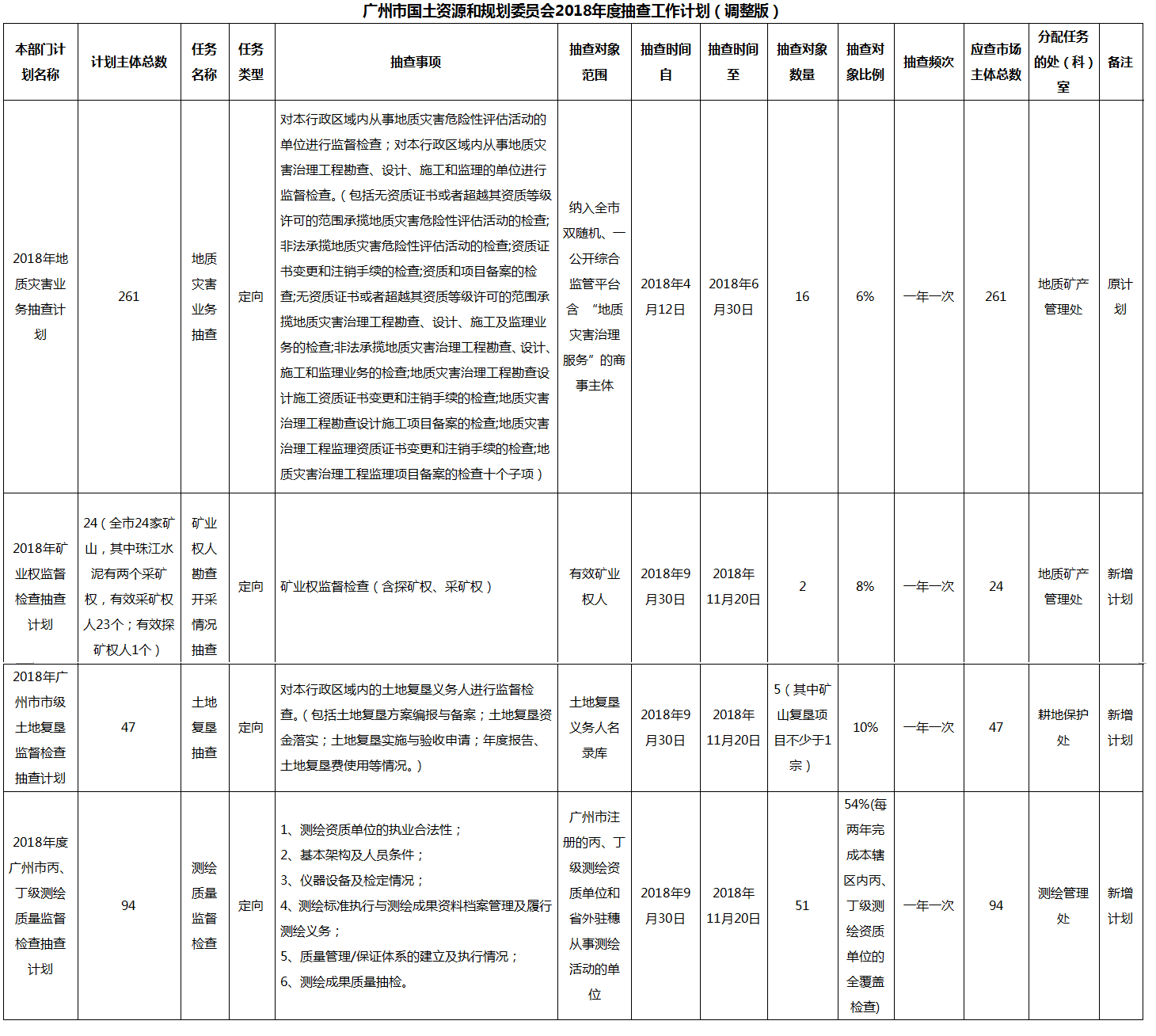 广州市国土资源和规划委员会2018年度抽查工作计划(调整版)