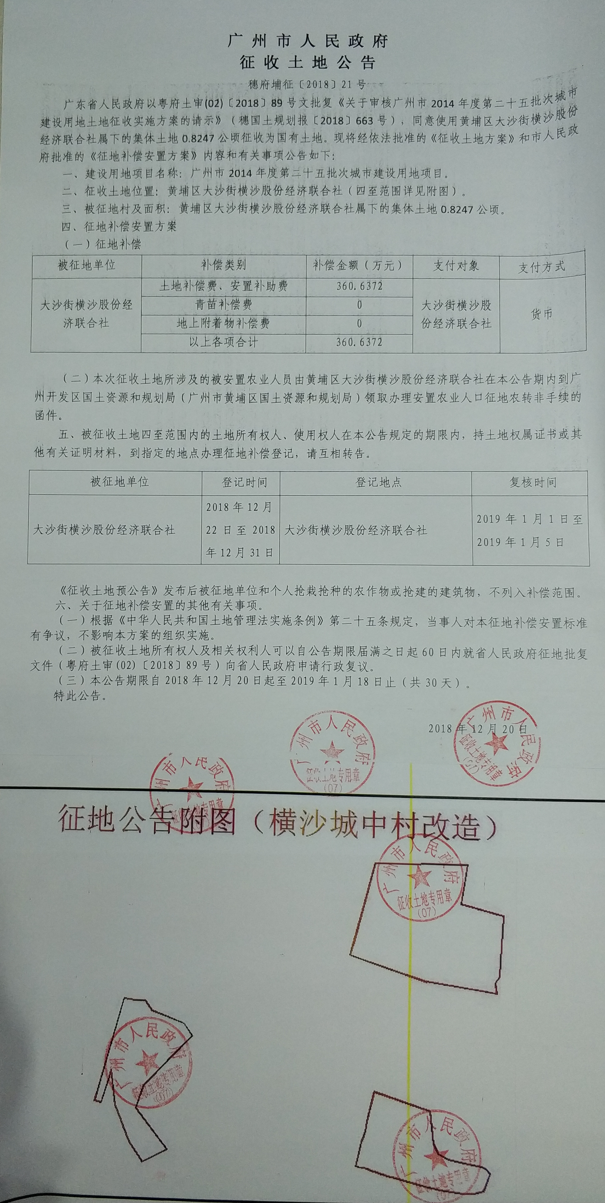 三、被征地村及面积:黄埔区大沙街横沙股份经济联合社属下的集体土地0.8247公顷。