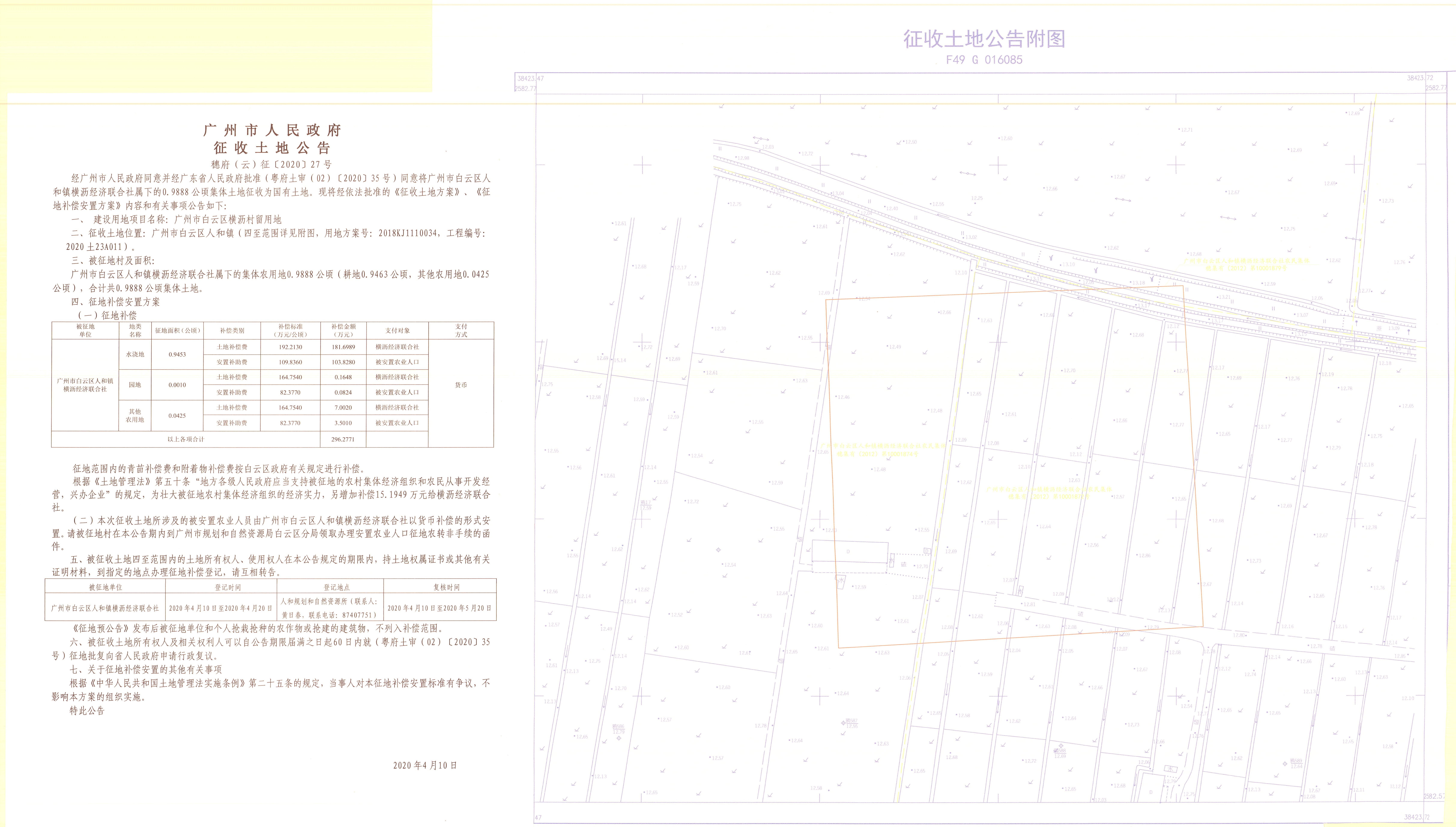 二、征收土地位置:广州市白云区人和镇(四至范围详见附图,用地方案号:2018KJ1110034,工程编号:2020土23A011)。