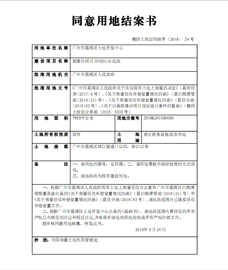 同意用地结案书(穗国土规划用结字〔2018〕24号)